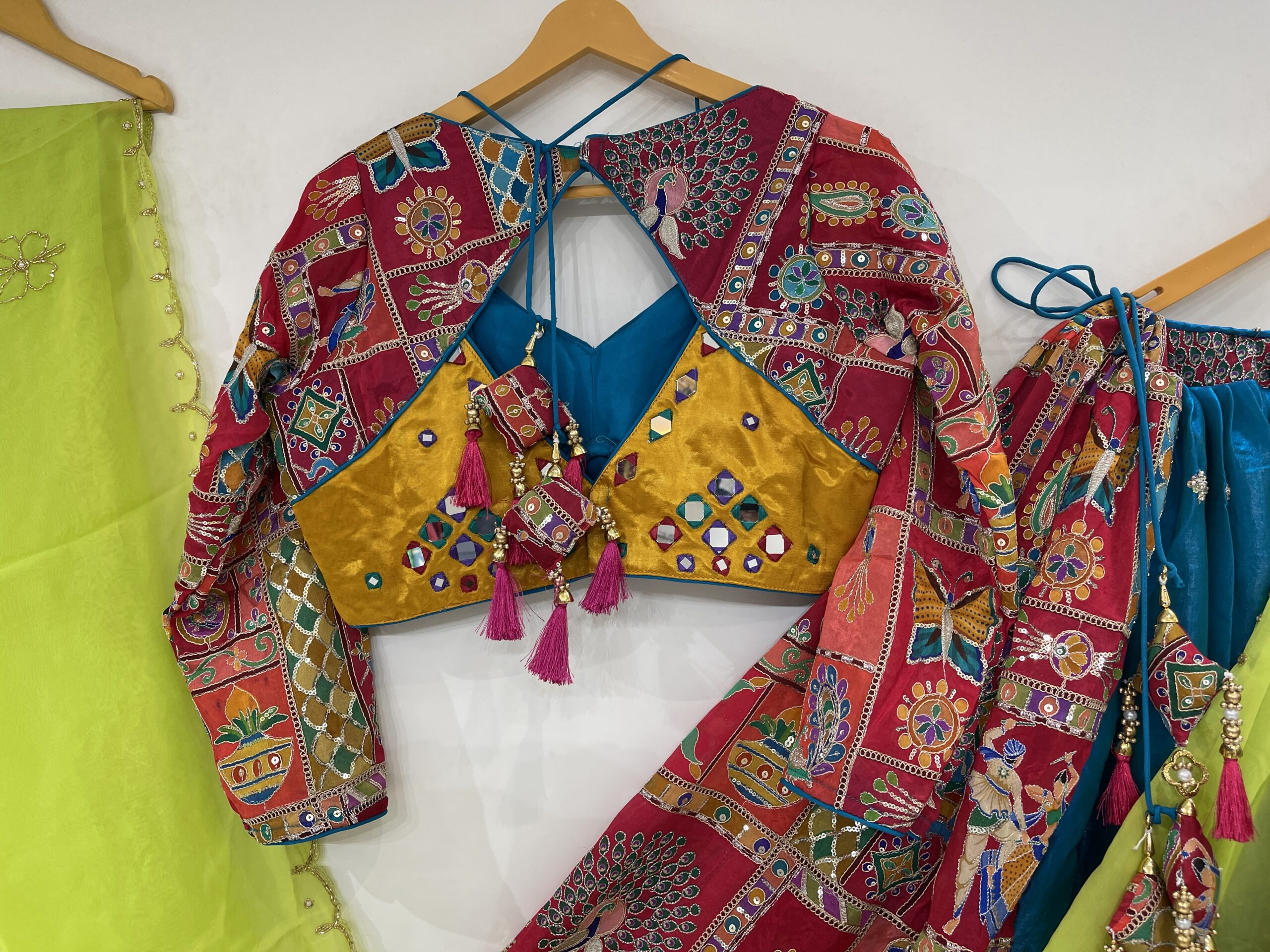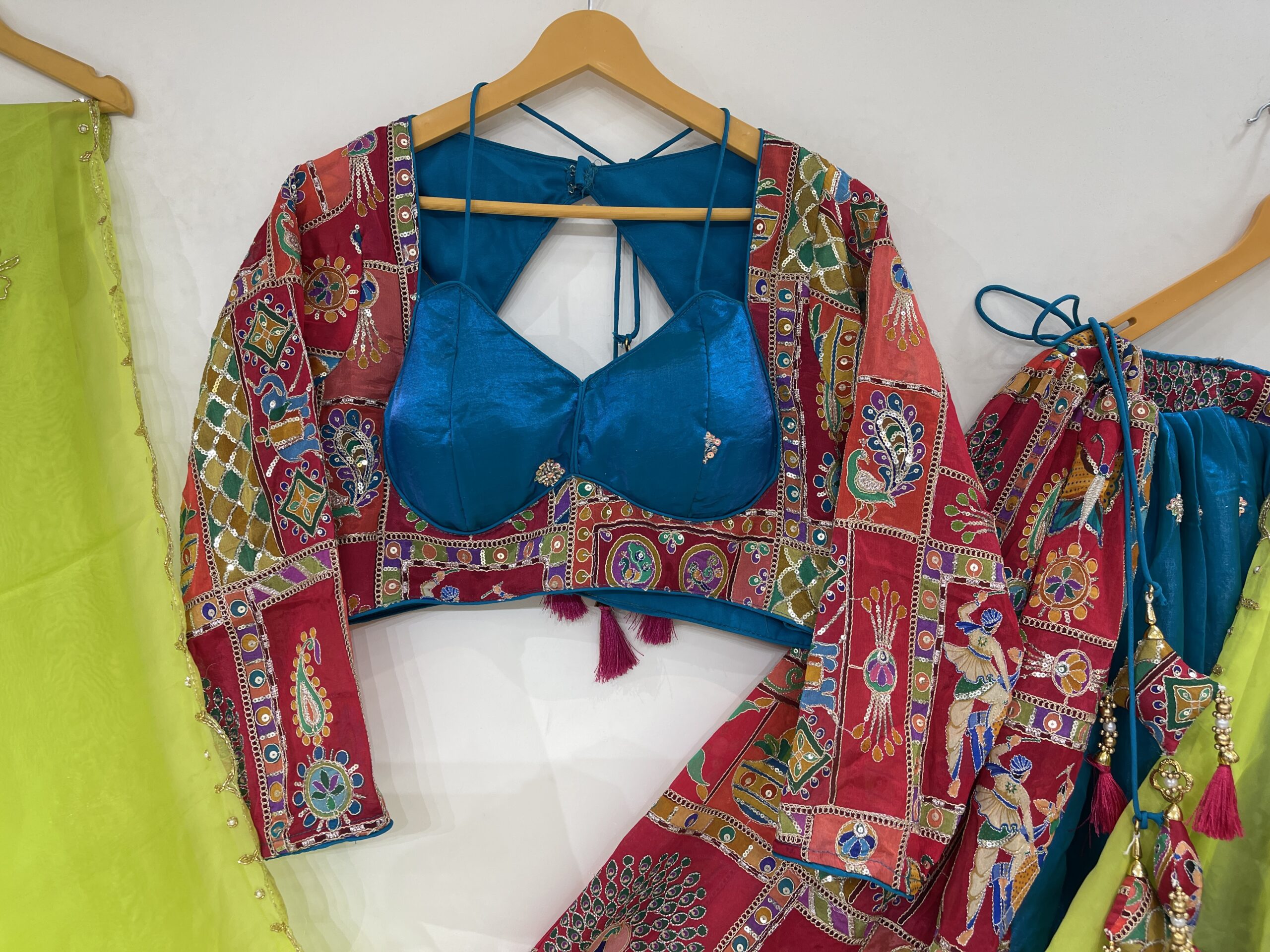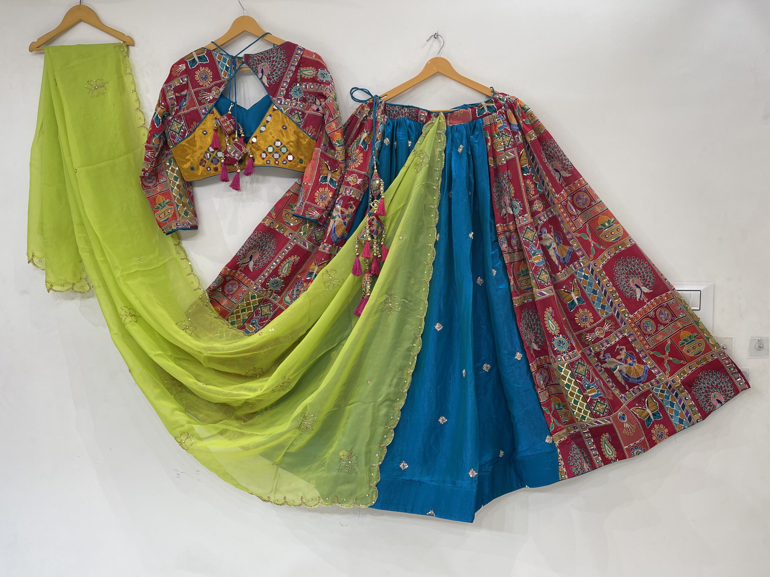 Celebrate tradition with a burst of color in this eye-catching chaniya choli set from Meera’s Lehenga. The lehenga is a stunning mix of bright blue and red printed panels, adorned with intricate mirror work and traditional folk motifs featuring peacocks, dancers, and cultural emblems that evoke the spirit of Garba.