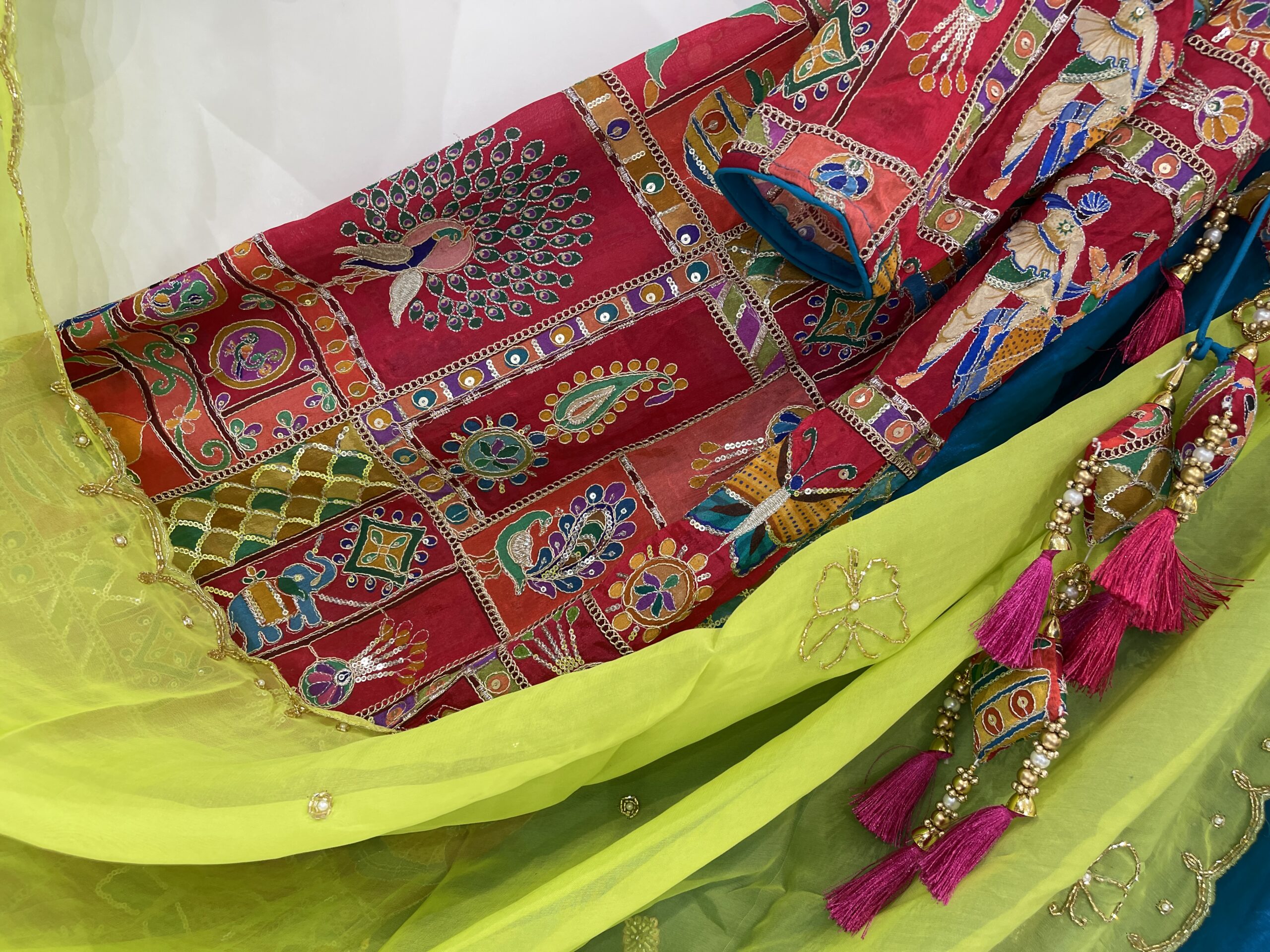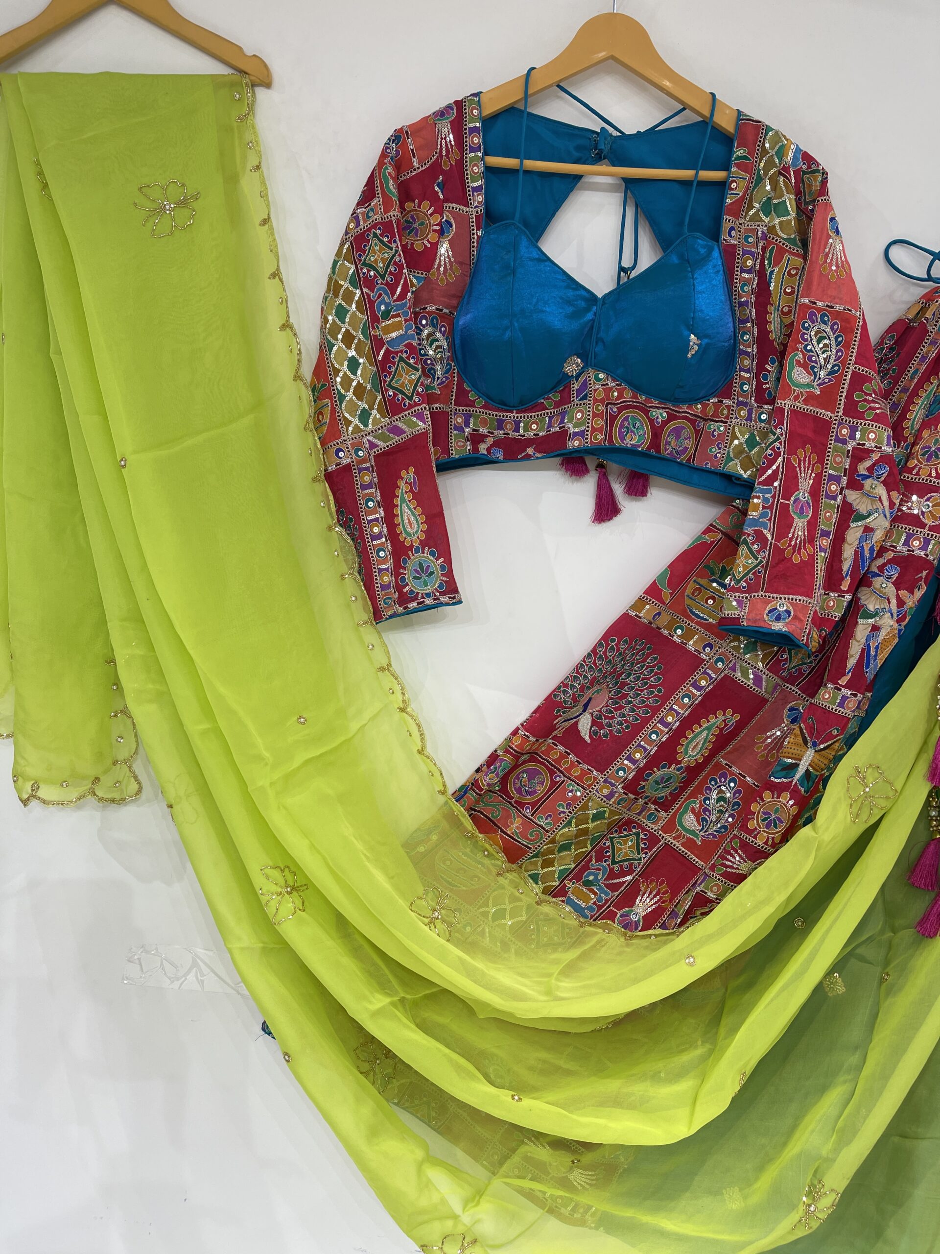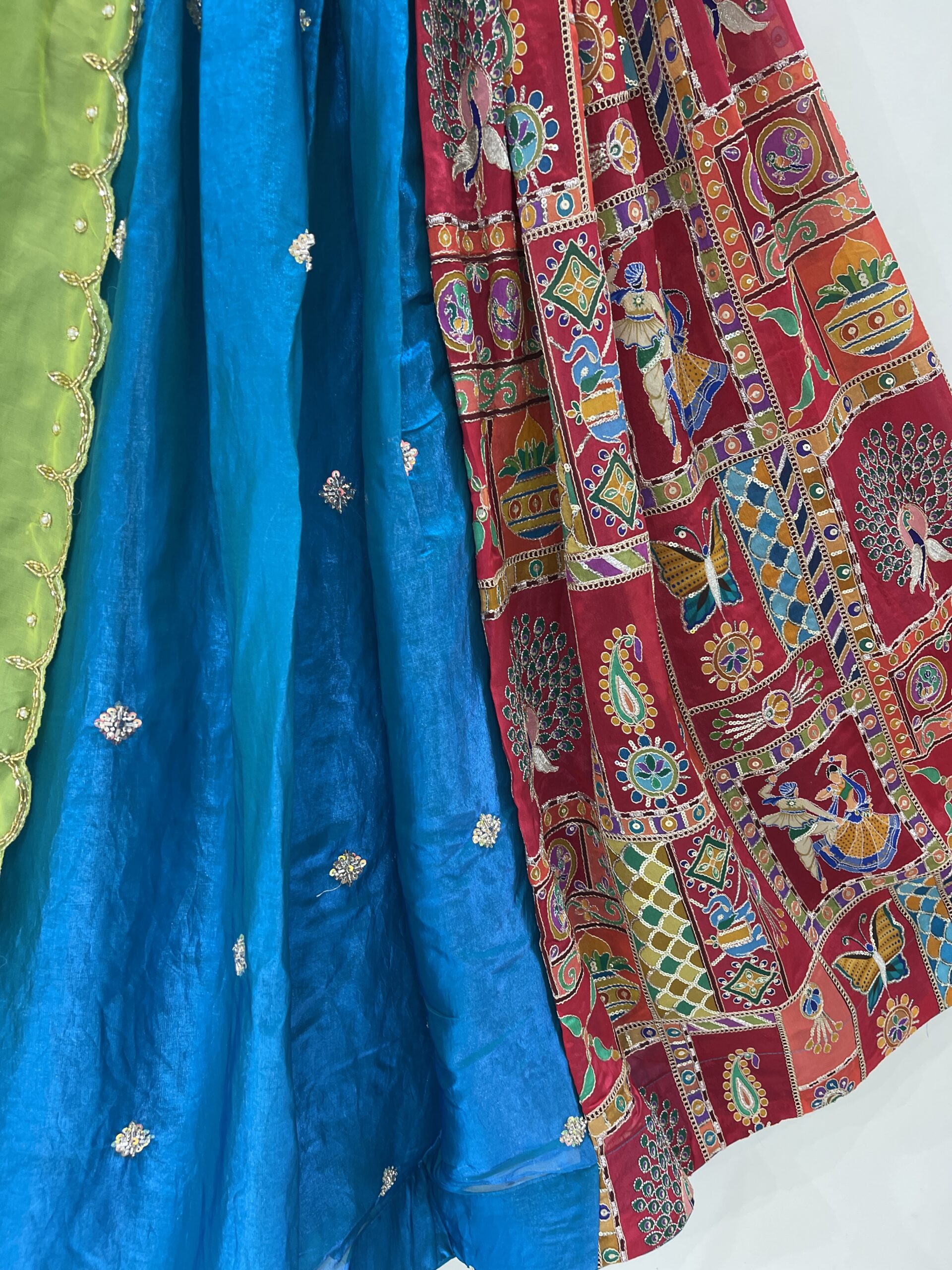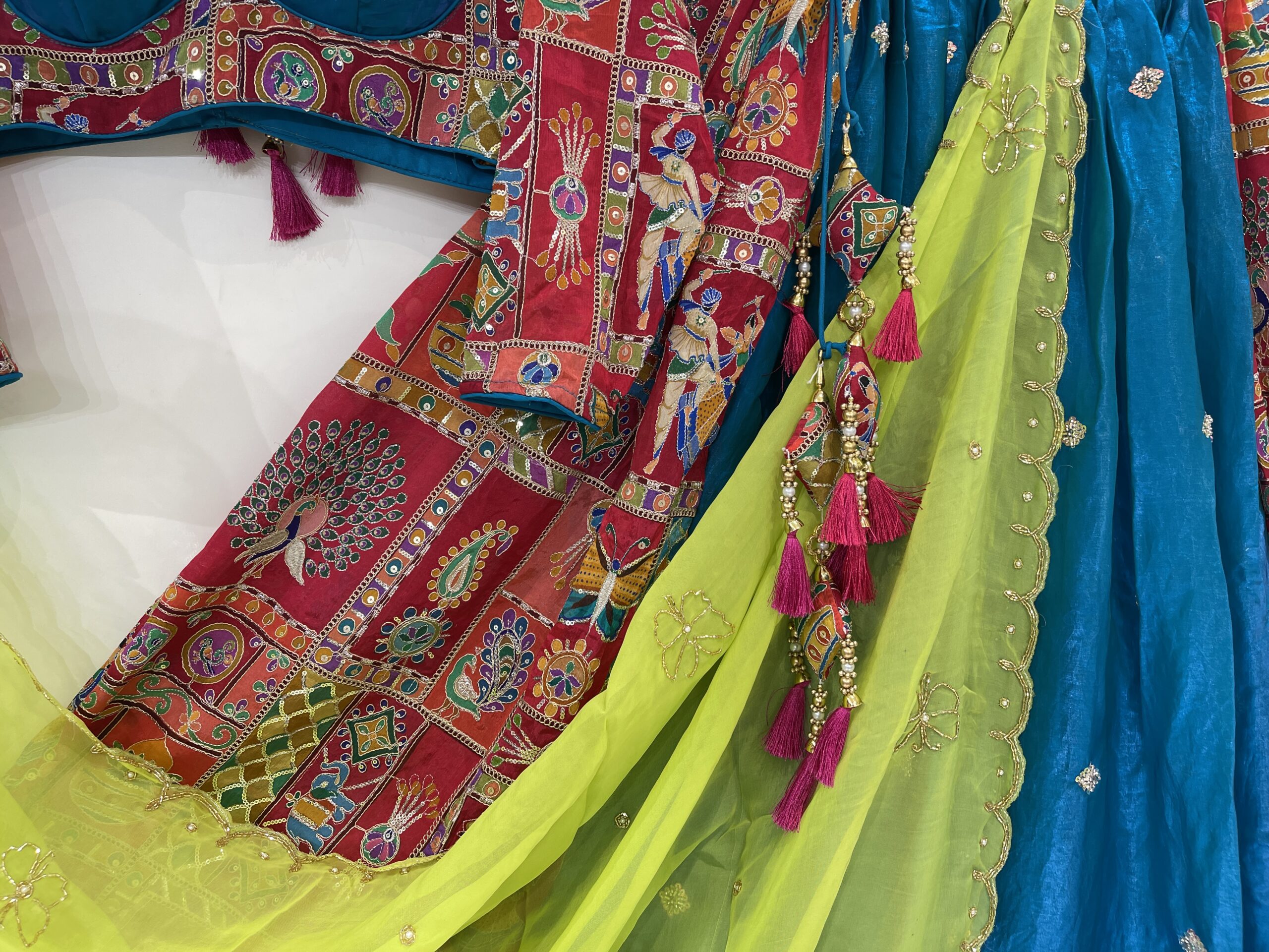Celebrate tradition with a burst of color in this eye-catching chaniya choli set from Meera’s Lehenga. The lehenga is a stunning mix of bright blue and red printed panels, adorned with intricate mirror work and traditional folk motifs featuring peacocks, dancers, and cultural emblems that evoke the spirit of Garba.