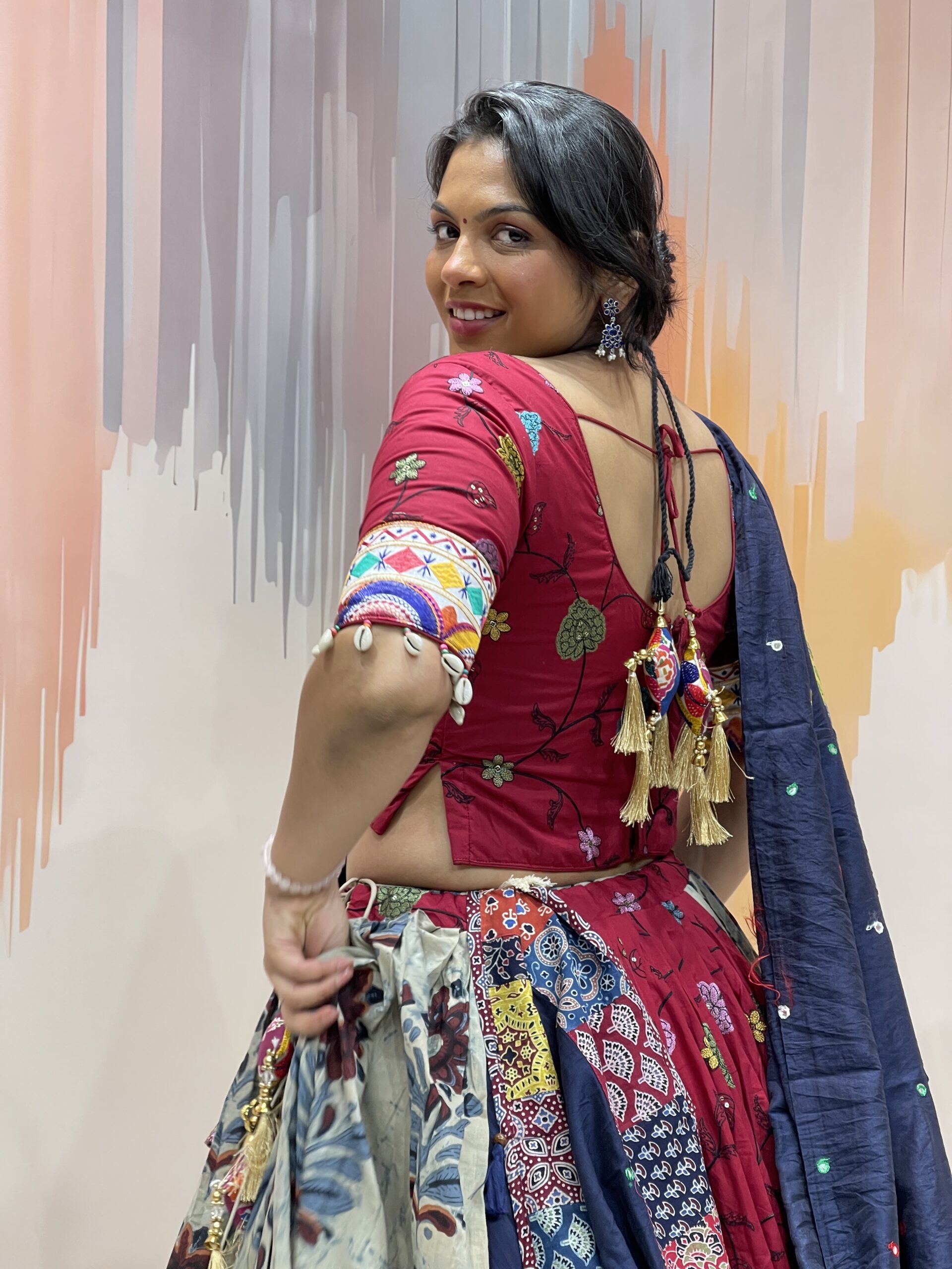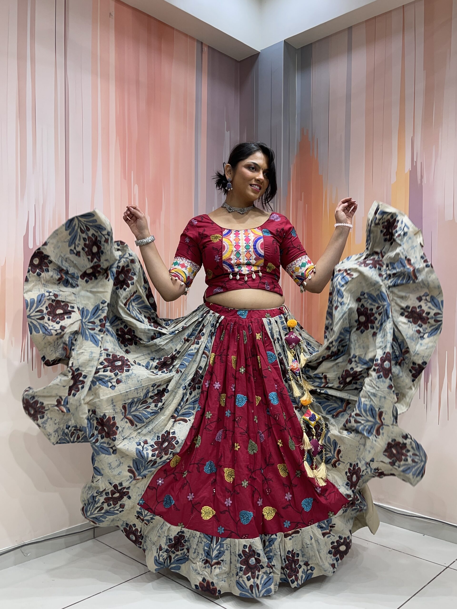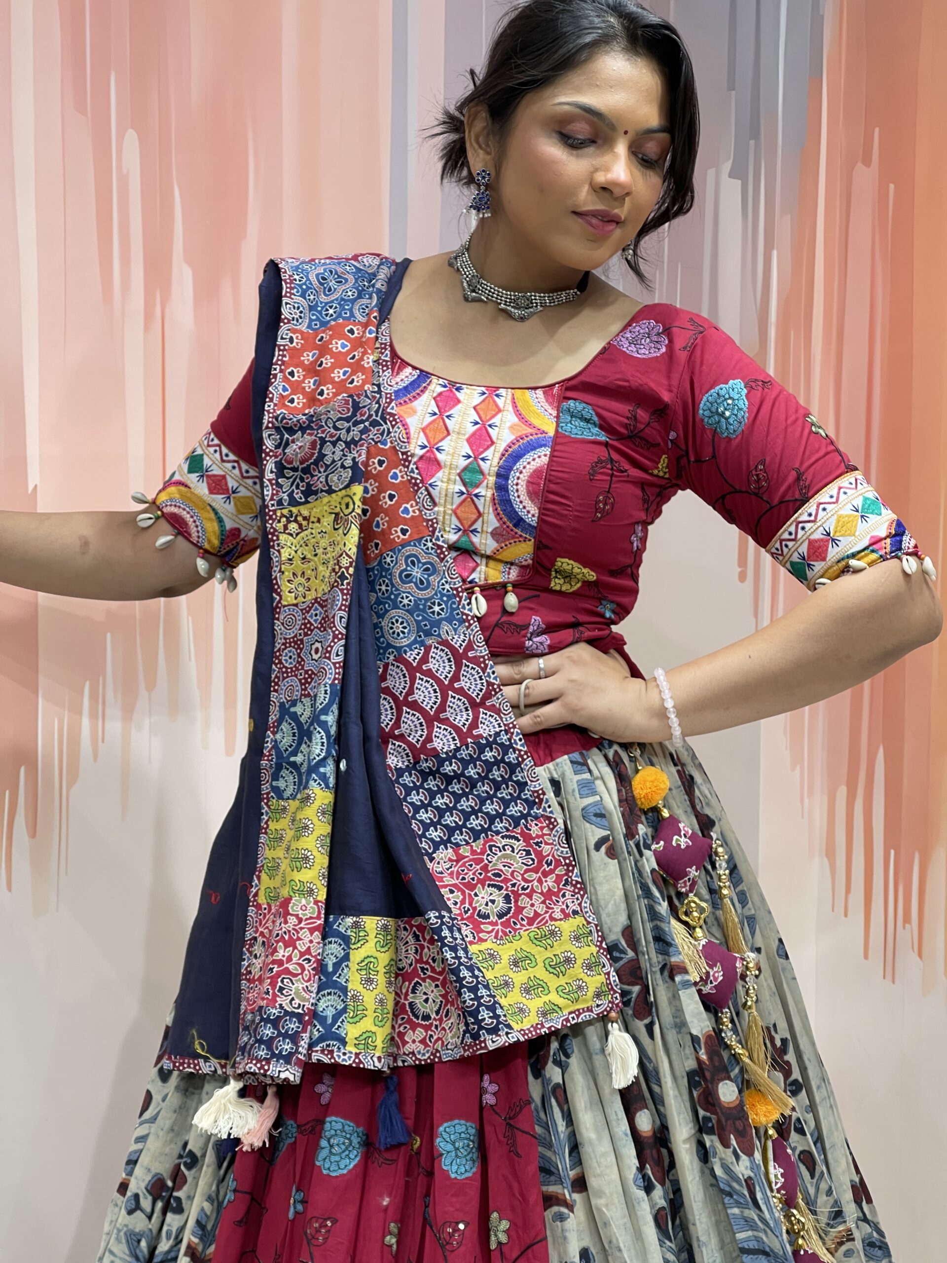The blouse is a work of wearable art, designed in a deep maroon base adorned with traditional Kutchi embroidery and circular mirror accents. The vibrant multicolour patterns in yellow, blue, orange, and white are inspired by Gujarat’s folk artistry, and the cotton fabric ensures breathable comfort even during long hours of dancing. The mid-length sleeves are finished with embroidered cuffs and white shell tassels for a charming and boho-chic touch.