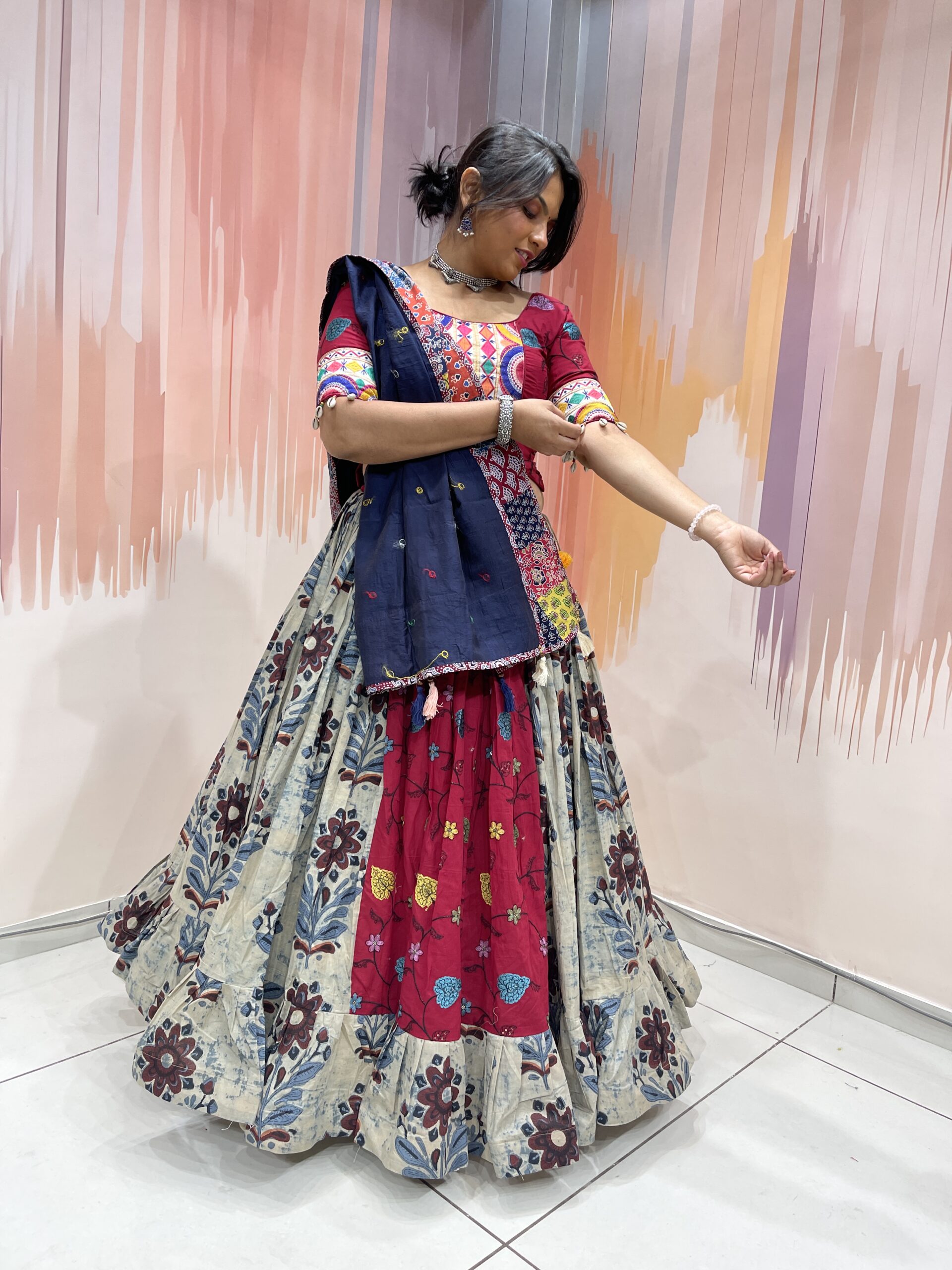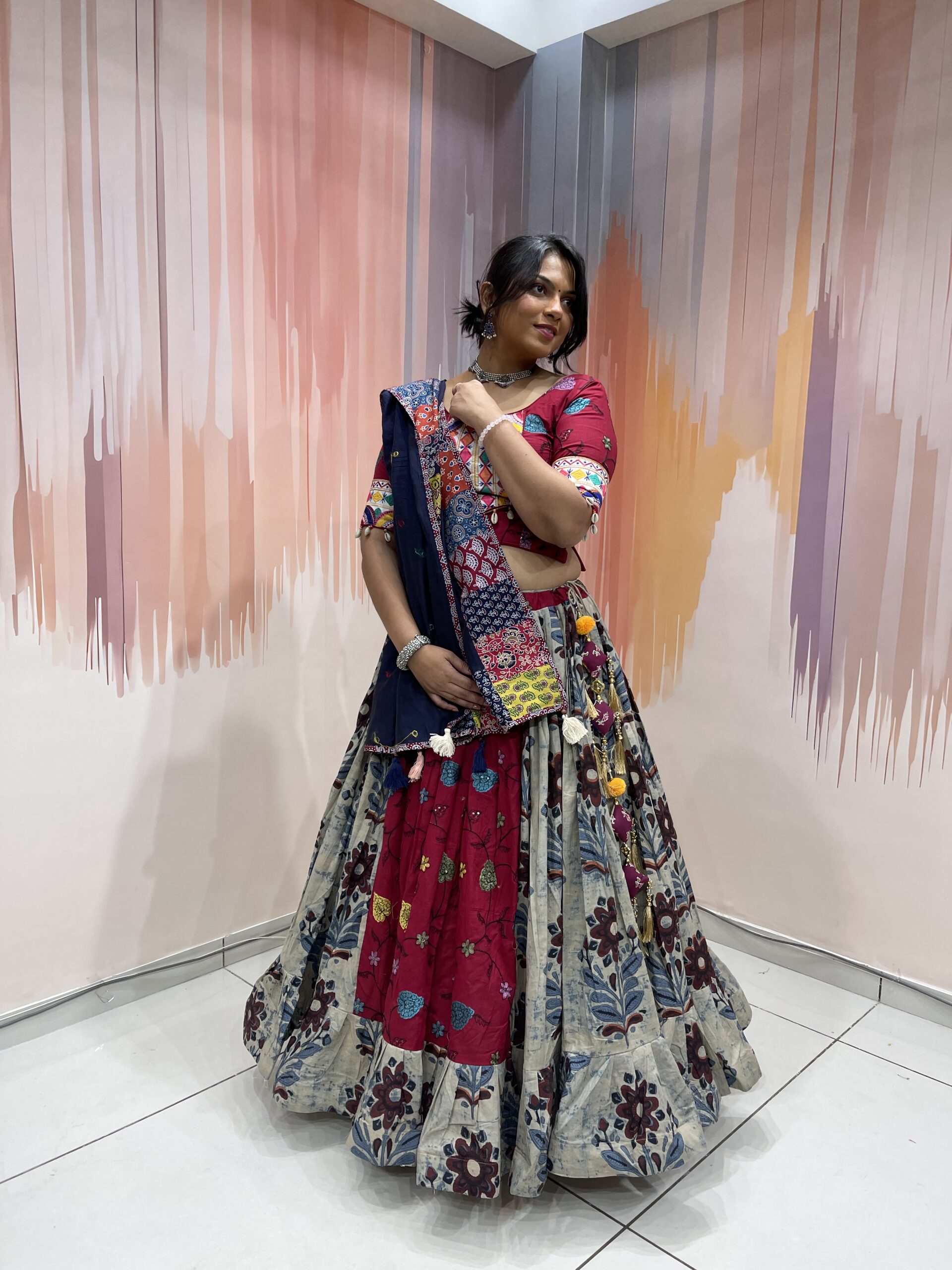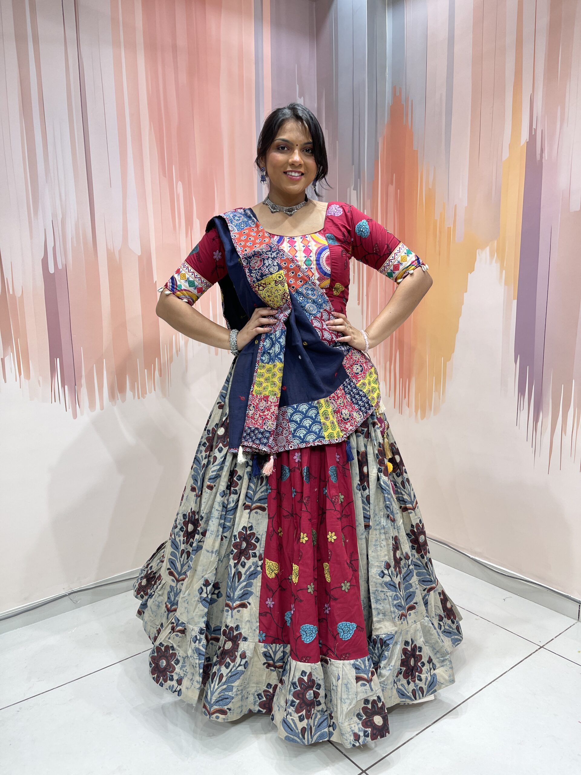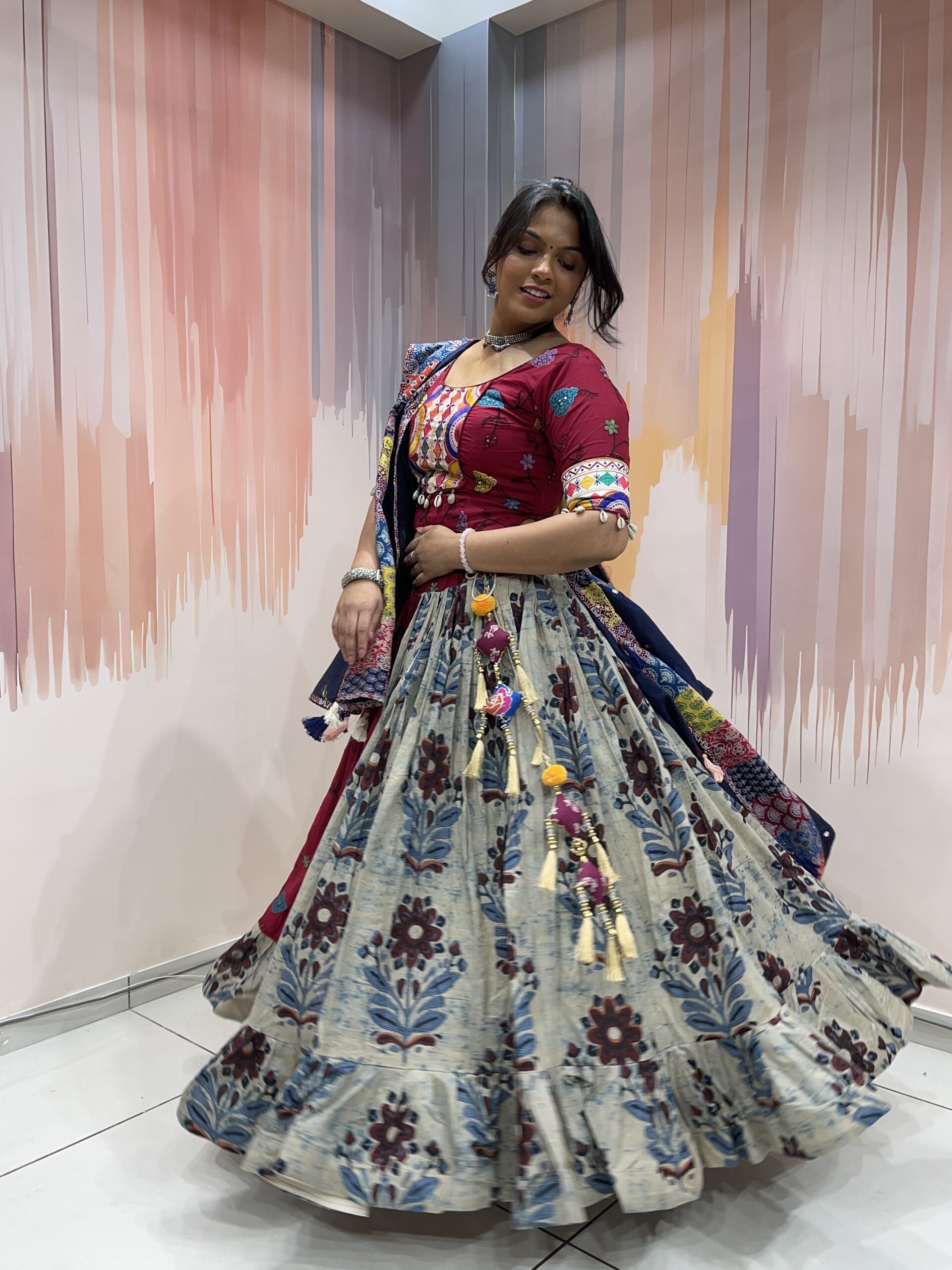The blouse is a work of wearable art, designed in a deep maroon base adorned with traditional Kutchi embroidery and circular mirror accents. The vibrant multicolour patterns in yellow, blue, orange, and white are inspired by Gujarat’s folk artistry, and the cotton fabric ensures breathable comfort even during long hours of dancing. The mid-length sleeves are finished with embroidered cuffs and white shell tassels for a charming and boho-chic touch.