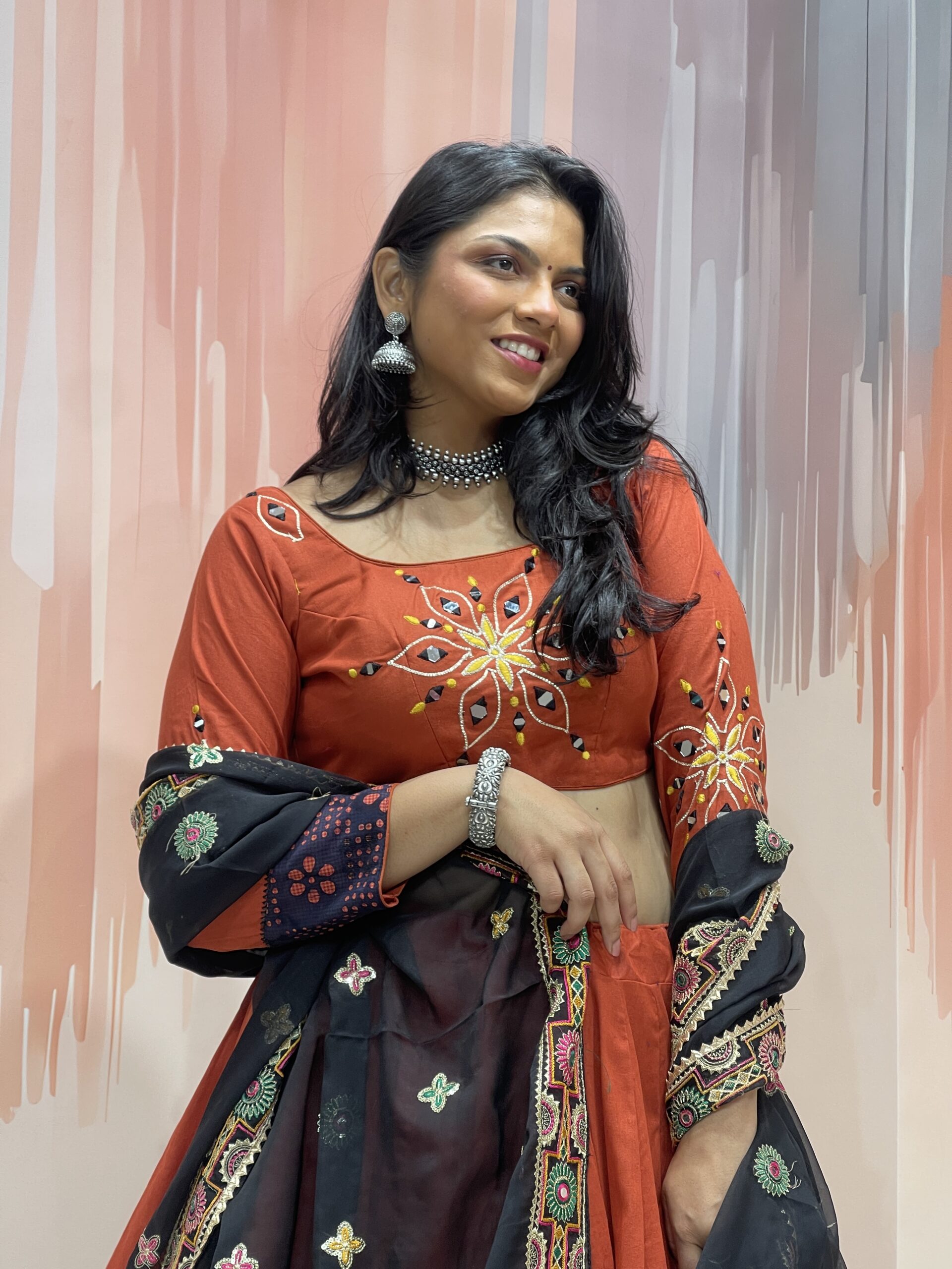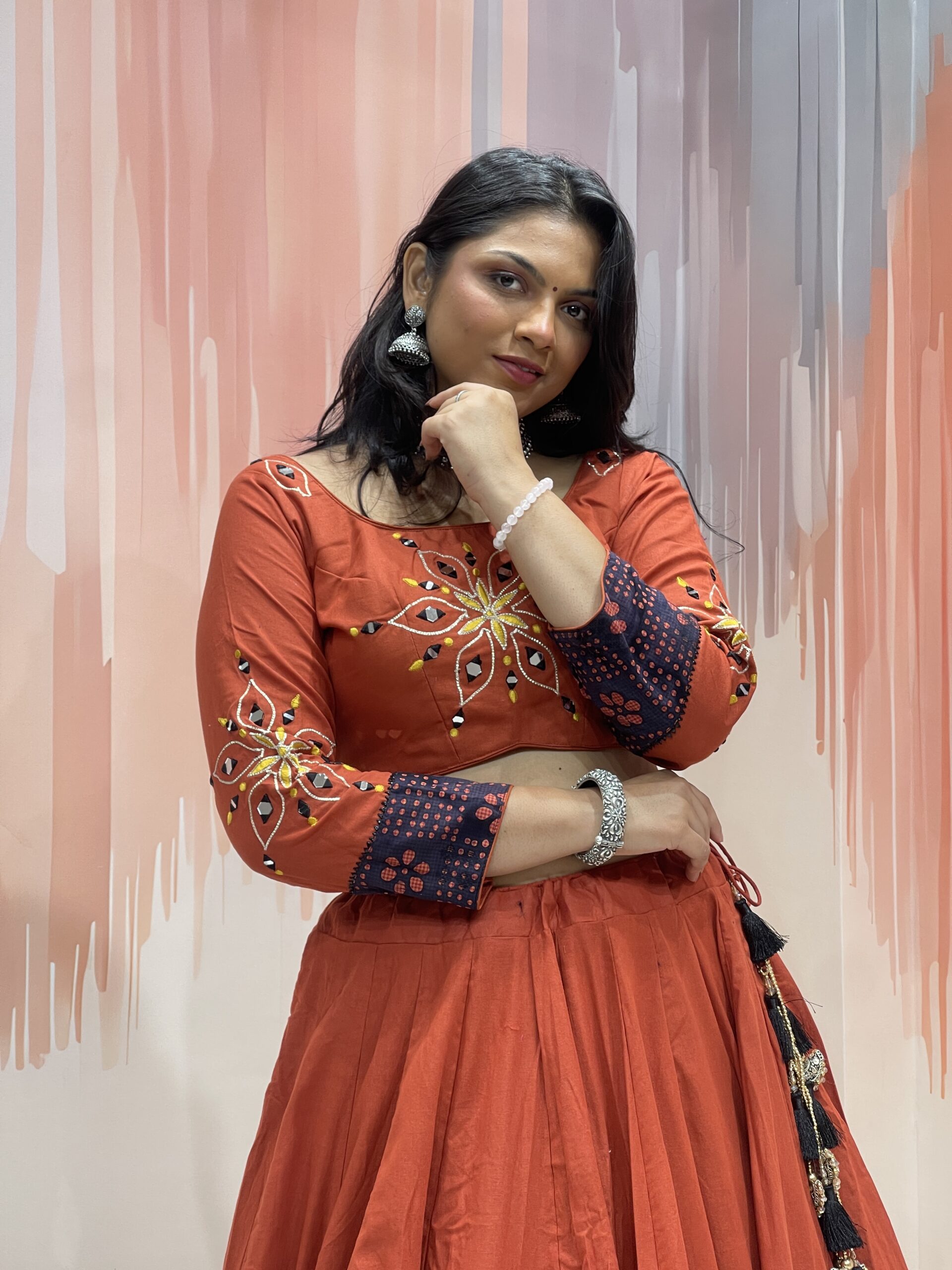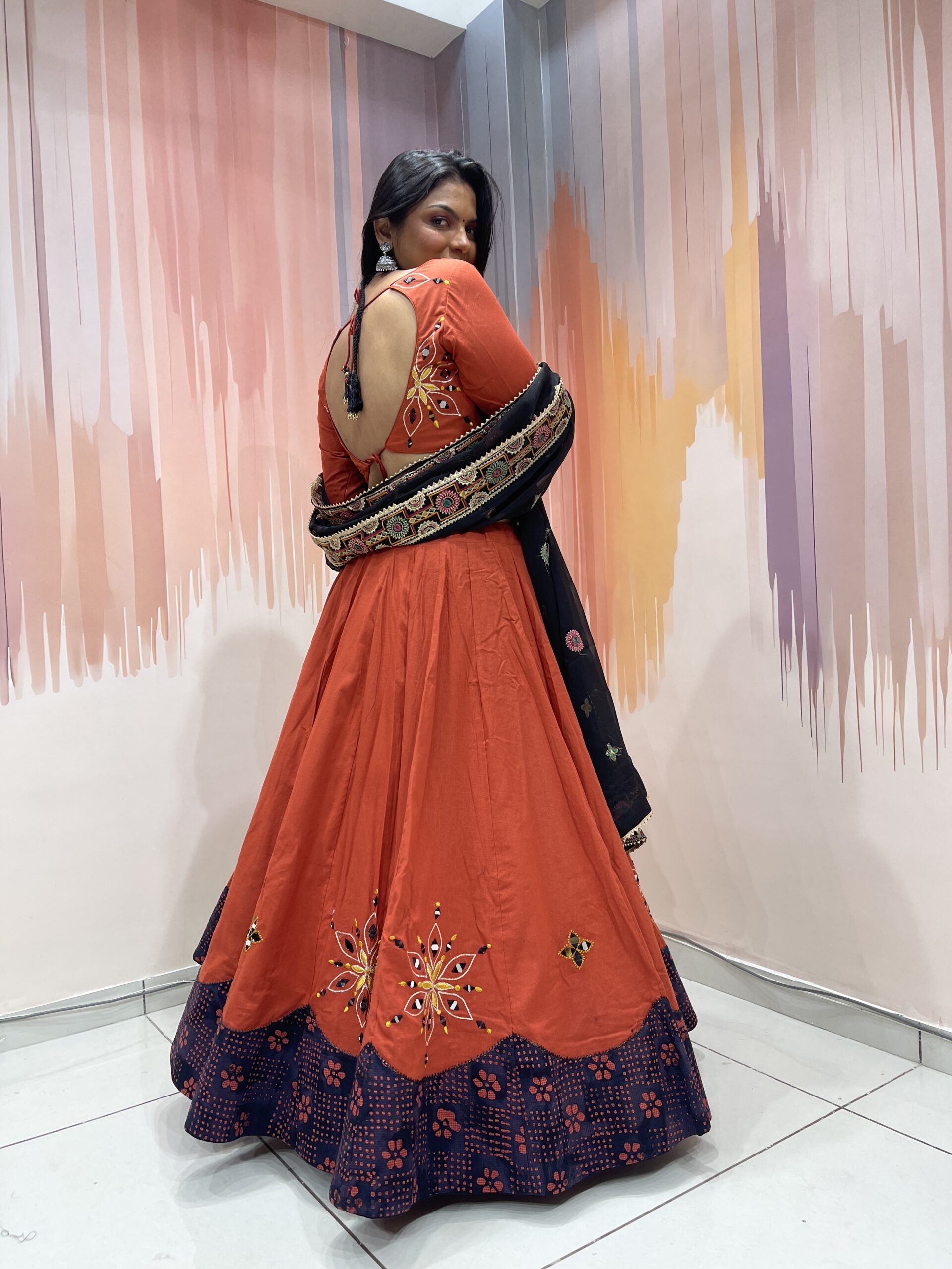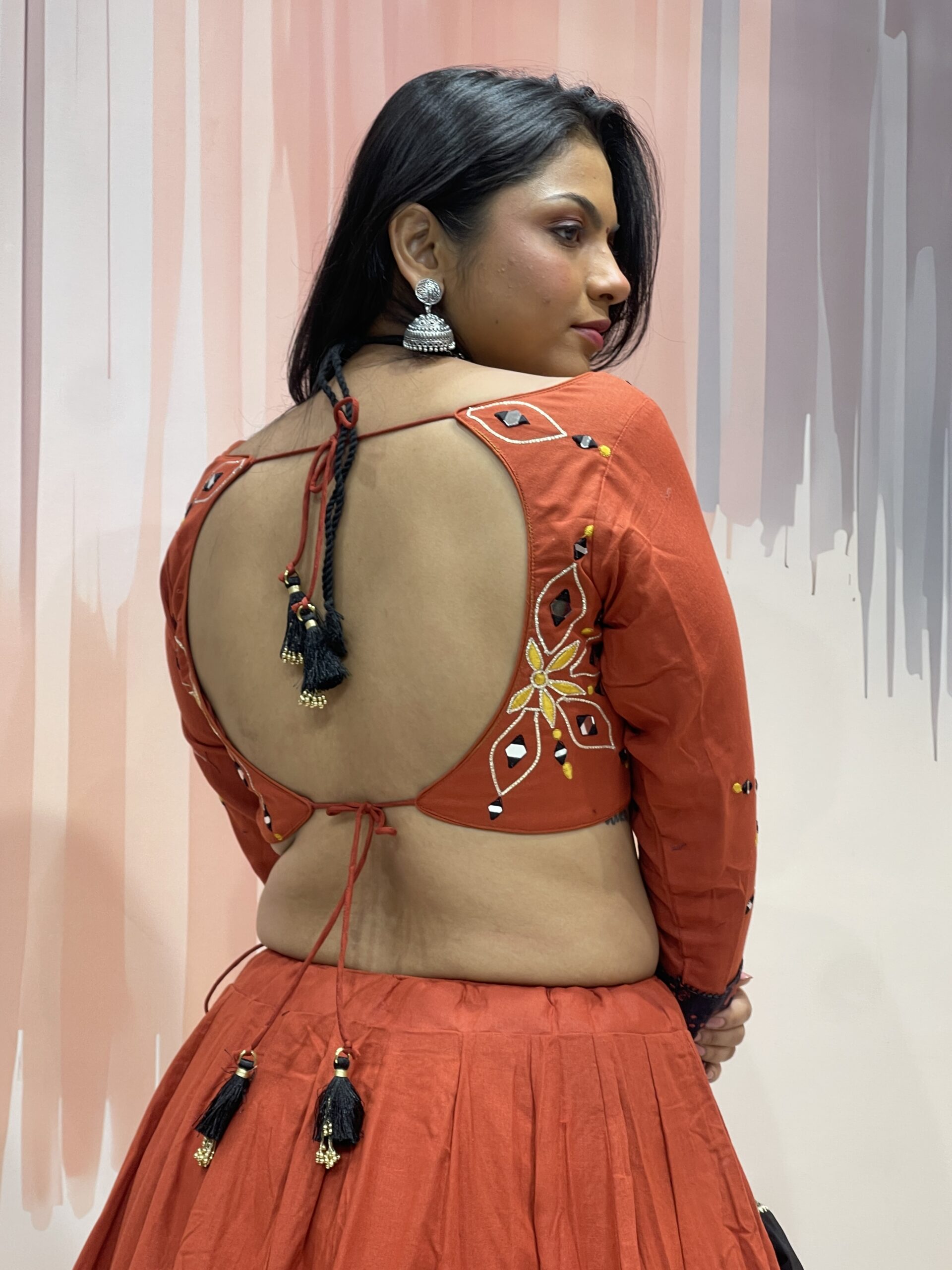The rust red blouse (choli) perfectly complements the lehenga with symmetrical mirror work and thread embroidery on both the front and sleeves. The back features a stylish scoop neck with dori tie-up and tassels, making it adjustable and fashion-forward. The sleeves have a striking black cuff section that mirrors the lehenga’s border, ensuring design consistency throughout the outfit.