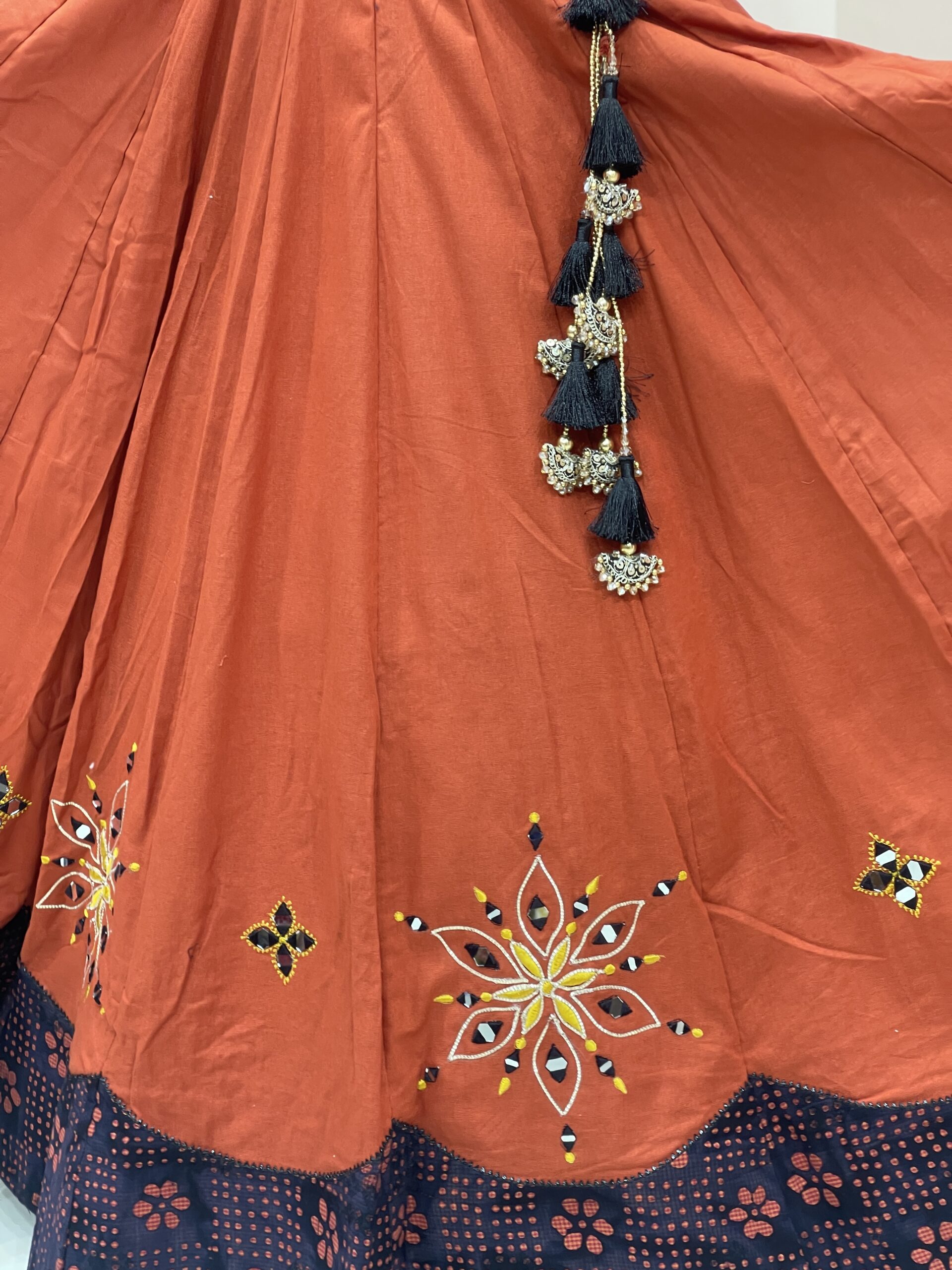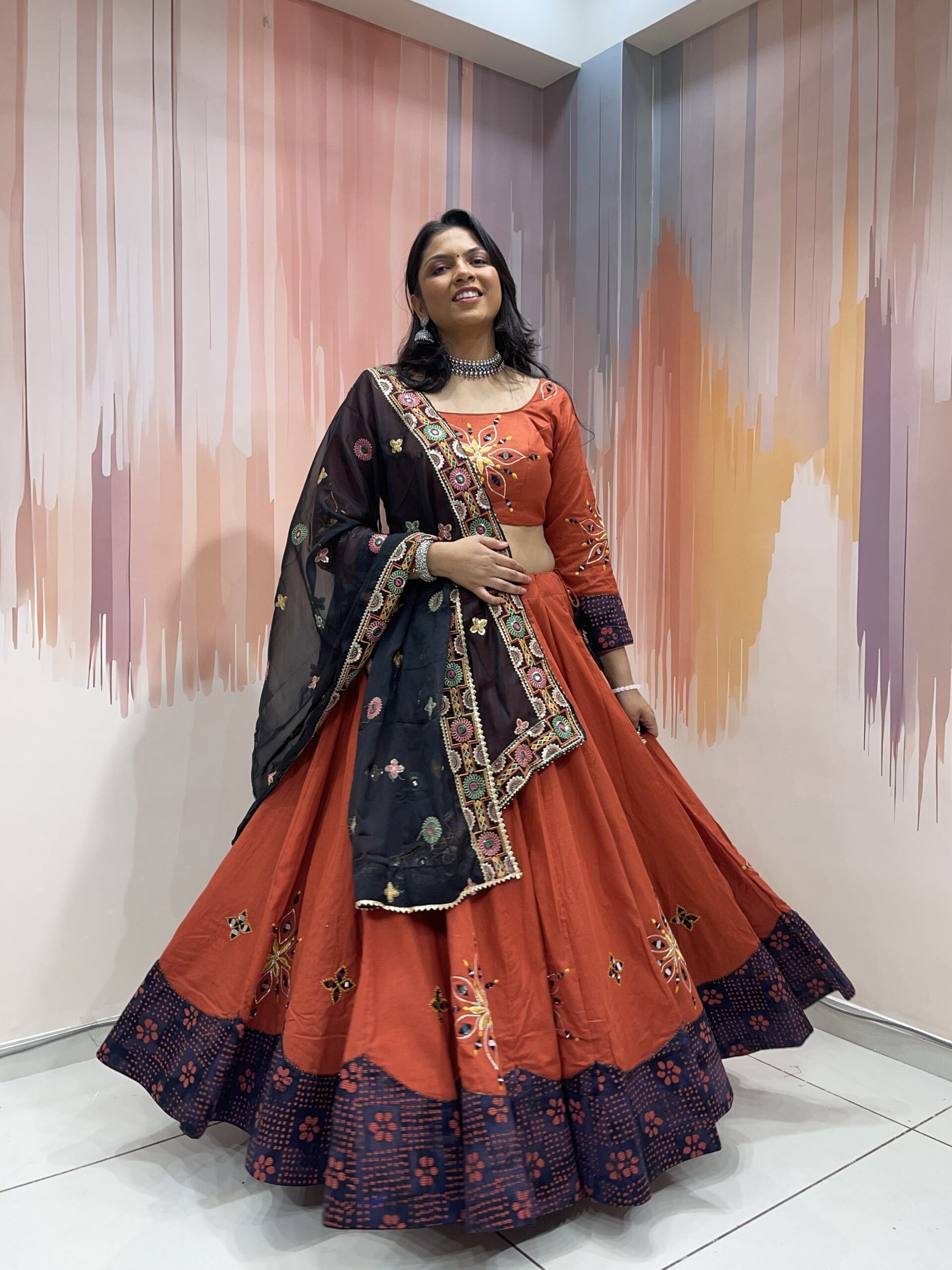This stunning three-piece Chaniya Choli set is anchored by a bold rust red lehenga, enriched with carefully embroidered floral and geometric mirror motifs. The broad black hemline, adorned with printed traditional patterns, adds contrast and character, making the outfit pop with ethnic vibrancy.